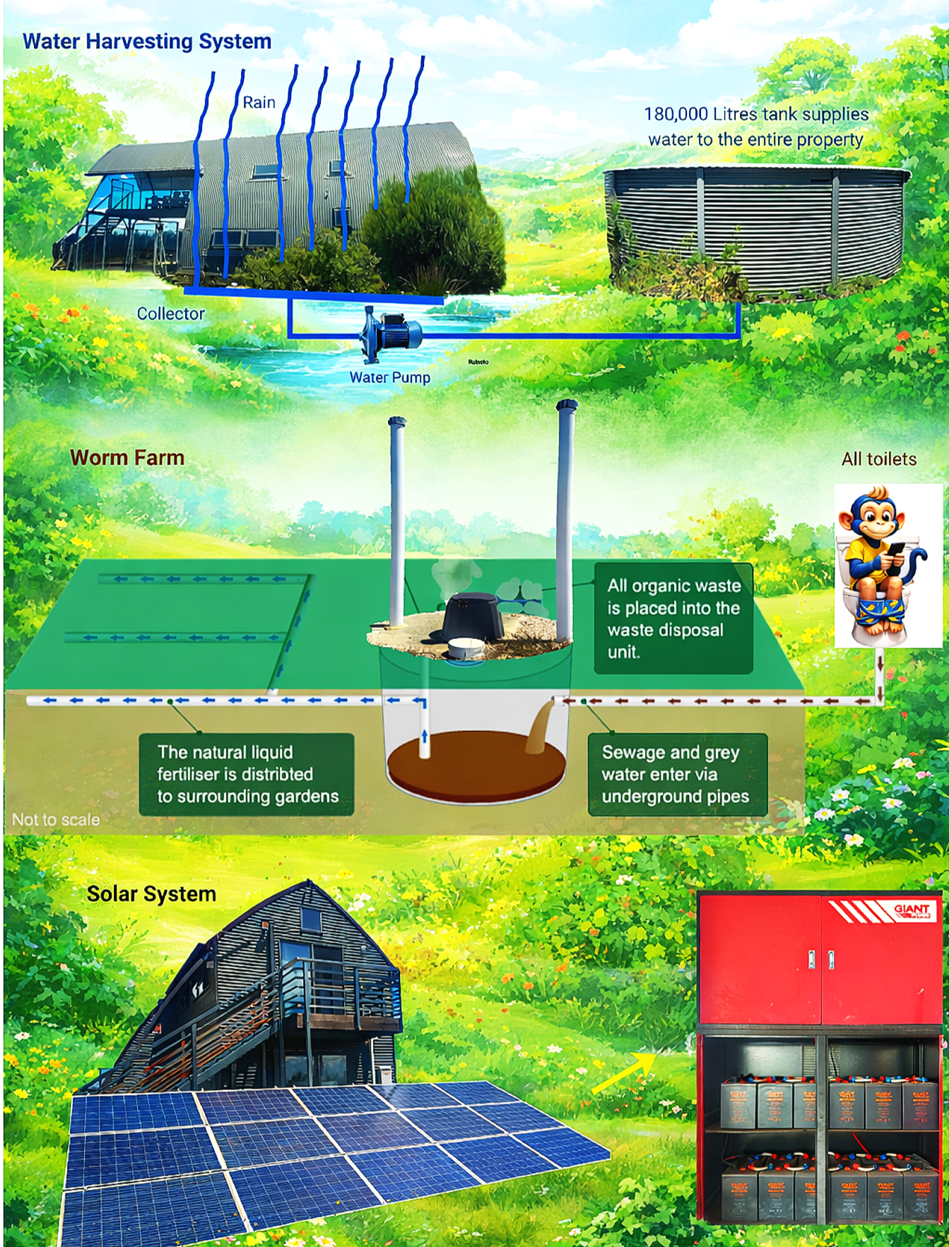 Blue Monkey Mountains (BMM) offers a true eco-experience, where comfort and sustainability exist in perfect balance. The property operates on an integrated rainwater harvesting system, storing over 180,000 litres to service the entire site. Organic waste and wastewater are naturally treated through a worm-farm system and returned to the land as nutrient-rich fertiliser. Powered by solar energy with battery storage, the property runs largely off-grid, minimising environmental impact. Together, these systems create a self-sufficient, low-impact retreat where guests can experience the beauty of the Blue Mountains while treading lightly on the landscape.